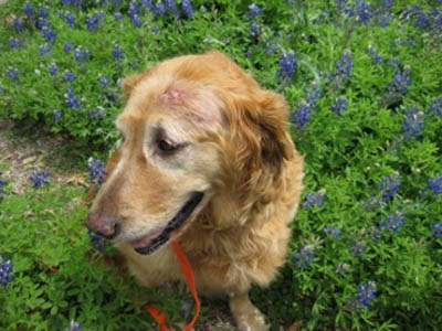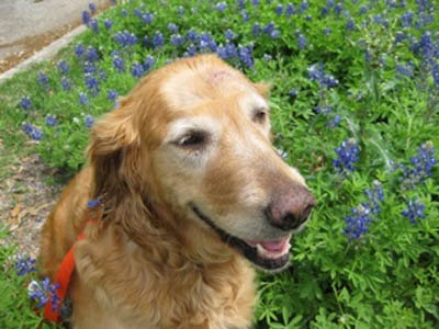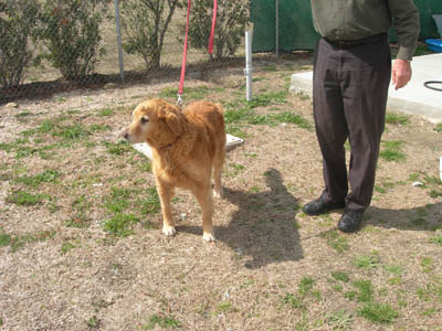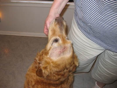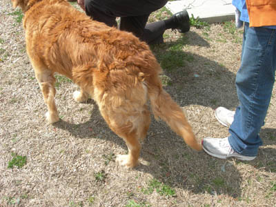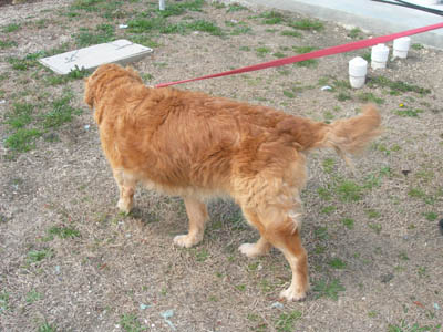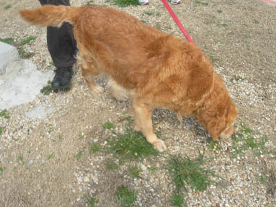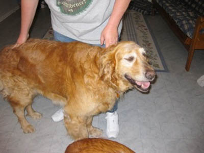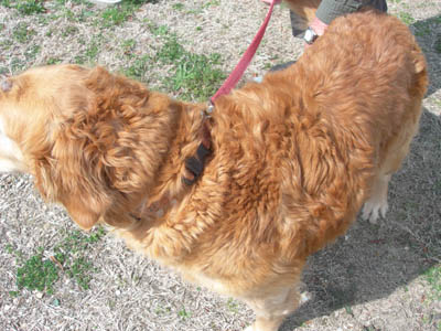 Chubby Vanna is excellent with other dogs of all ages—and quite the femme fatale where older boy Goldens are concerned! She spent some time at Margo’s house, where Thunder, age 13, immediately fell under her spell: “Thunder spent lots of time washing Vanna's head & incision. He tried to hump her twice (pretty silly of him, since he is so elderly & small), and Vanna gave a loud roar each time... you should have seen Old Thunder backpedal! He learned his lesson & took care to follow Vanna's rules thereafter.” Upon arriving in her longer-term foster home, she promptly entranced Mason, age 9: “As soon as he noticed Vanna, he STRUTTED over and it was instant love. Last night he did not want to sleep on the bed with Mom. He wanted to be down beside Vanna. So funny.”