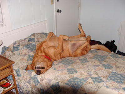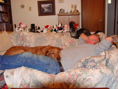 his head on the pillow snoring, with his favorite cat bunked in with him. I also