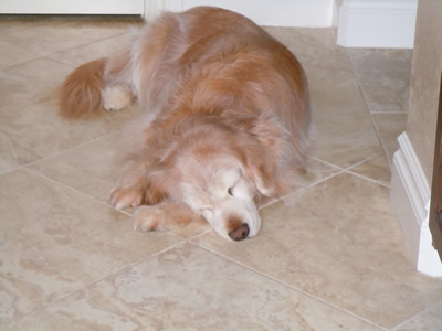 Ziggy loves to be around our other Golden. Plays well, kisses, cuddles at night, & the two chase each other in yard. We heard he had to be carried to the car when traveling from the shelter, but on the way home from the vet’s he had a good time and poked his nose out the window! Ziggy likes to be right next to people in the house; he loves to be touched and petted, and tries to get in bed or on the couch with us. He follows us around. If he doesn’t have a toy, he will pick up a shoe/sock/towel or anything lying on the floor and carry it in his mouth—he doesn’t chew it, just carries it around while wagging his tail. He loves to play in the house, but also knows when it’s time for bed—and he sleeps through the night, too.