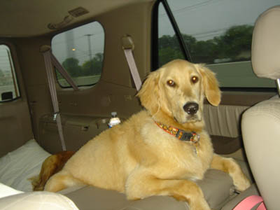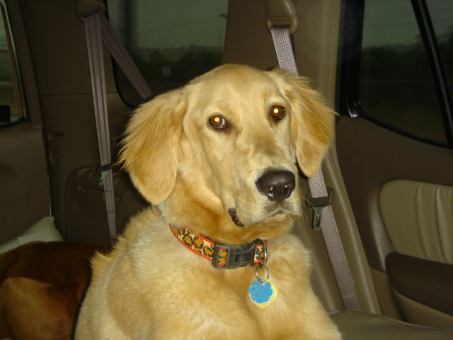 Found running stray back in August, Rocket is 10 or 11 months old now, with all the energy you’d expect of a young Golden. He’s a handsome boy with a beautiful coat, a sweet personality, and LOTS of zip! He loves his Golden foster sister and spends hours play-fighting with her until they are both too pooped to play any longer. He’s great with cats – as far as he is concerned, they don’t exist. He loves all his toys, too, and promptly shreds them to pieces no matter how “dog proof” they (supposedly) are, but he is a good boy and does not tear up anything but his own toys. His favorite sport is swimming, and he’d stay in the pool all day long if we would let him. Another favorite sport, unfortunately, is attempting to “rocket” after cars—that’s one that we are working to discourage, needless to say! We’re teaching him to “look” and offering a super-special treat each time a car comes into view, with the idea that eventually he’ll be so excited about the treat that he’ll sit down and look at mom & dad, NOT at the street, when he hears an auto approaching.