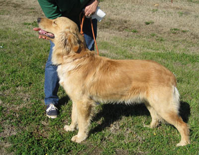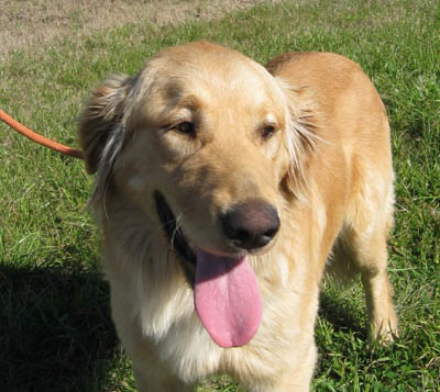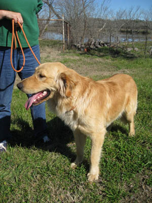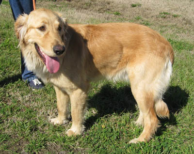 At a local shelter to check out a few other dogs, a volunteer for another rescue group spotted a big gold dog in a back room. Seems he was on hold for an adoptive family, but 3 days past the pick-up date, they still hadn’t shown. She called our Hotline: “I am pretty sure he’s purebred… lighter gold, has a big block head.” A GRR volunteer headed out right away—one look at him, and it was “Wow! we hit the jackpot with this one.”