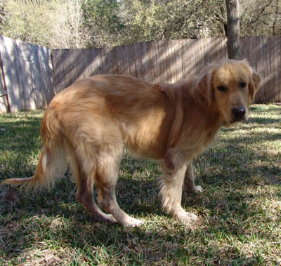 Unfortunately, beautiful Jupiter has hip dysplasia—not an uncommon problem in Goldens. He is doing fine now and shows no symptoms other than a bunny hop when he runs. The vets feel he does not need to have surgery now, but he may need it in future… or then again, he may not! In the meantime we have him on glucosamine and Syn-Flex, and he will need to stay on that forever.