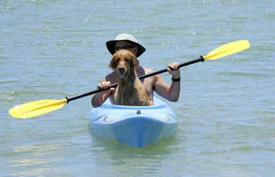 We did the most awesome thing! We loaded up in the car - all four dogs in the back of an SUV- and went to the lake. I showed everyone that I can swim. Playing in the water is so much fun, and I had a blast plowing my nose through the waves. My three dogs friends like to retrieve balls and Frisbees, so I joined right in. I helped Aspen and Sassy bring the Frisbee back. Guess what else I learned? I may have some nautical blood flowing through these veins. Haven’t sailed the seven seas, but I hopped right into a kayak and took several spins around the lake. Take a look at my picture, and you’ll see what I mean.