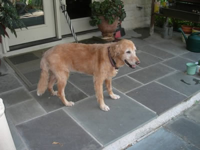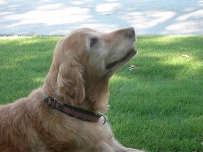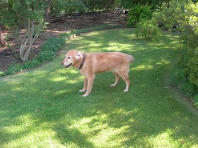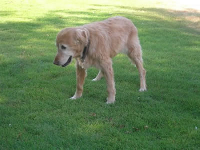 On July 2, 2010, a petite senior Golden arrived at a local shelter. Since nobody came looking for her, GRR was called—and this little girl, given the name “Bubbles,” became part of the GRR family on July 6. First stop was the vet clinic, where Bubbles had a bath, a check-up, and, on July 9, surgery to remove a small growth on one eyelid and to repair entropion in both eyes (entropion is a condition in which the lower lids turn inward, so that the lashes scratch painfully at the eyeball). On Saturday, July 10, she headed to her foster home, wearing an Elizabethan collar. She was always sweet and patient, but her foster parents could tell she was in pain despite her pain meds; they were worried, too, about a pink discharge from her left eye. So, first thing Monday, another vet date was set; and on Tuesday, Bubbles ( by then affectionately known as “Phoebe” to her family) underwent emergency surgery. It turned out that a loose suture was scraping at her cornea, and the vet stitched Bubbles’s third eyelid down to aid healing and keep the eye protected. For the next 3 weeks, this darling, patient lady had to keep on wearing that hard E-collar to keep her from scratching at her eyes.