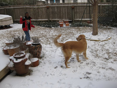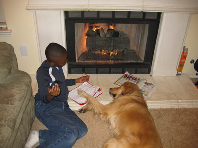 I had a blast with all the kids when it snowed. They threw snowballs for me to catch, and then we all went to their cousins' house and I ran around the yard in the snow having fun while all the kids jumped on the trampoline. After that, we came back home and spent hours laying in front of the fireplace together. I must have looked really handsome, because they just couldn't stop petting me! It was very cozy lying all together all day.