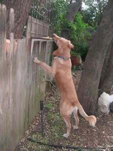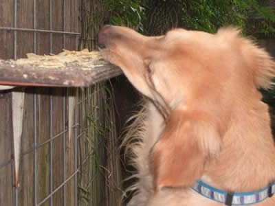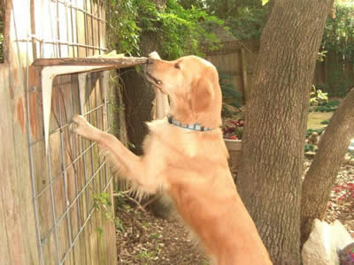 Sparky is a countersurfer extraordinaire!! He took my English muffin out of the toaster yesterday! I was sure I had pushed the toaster back far enough so he couldn't reach it. Wrong! He also ate the remaining muffin which I also thought was back far enough. Wrong again. Later in the week he outdid himself by counter surfing at our outdoor bird feeder (see photos). The fence is 6 feet tall so he's right at the 5-foot level. (No way is our Thanksgiving turkey being left unguarded on our counter!)