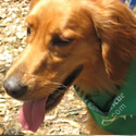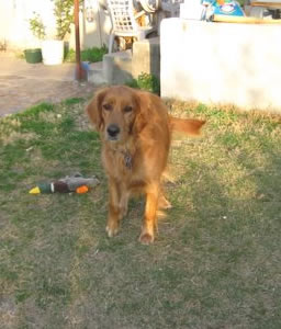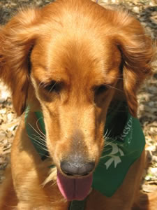 Her official GRR name is “Baby” -- but if you say "baby," she will bring you a stuffed squeaky toy. She knows her real name is "Buffy.” And I am here to introduce you to the star you have all heard about: Buffy-the-Vampire-Slayer. Yes, this cute little girl is not only friendly, but very brave. Just watch as she will save you from an attacking squeaky toy by taking it away from you. Ever vigilant, Buffy sits on command, ready to spring into action against a scary bird shadow or to ensure that an evil dog treat is subdued & obliterated!