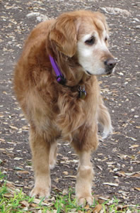 At the clinic, along with a name (“Molasses”), the first GRR Golden of March 2011 got the full medical work-up. We were expecting bad news, but -- no heartworms, no intestinal parasites, just a cyst on her head (benign) and a tummy absolutely loaded with, literally, garbage. She’d apparently been dumpster-diving to keep body and soul together, and whatever rubbish she had eaten had made her deathly ill. No sooner had she arrived at the hospital, in fact, than her body set about getting rid of the whole mess—it was “good riddance to bad rubbish” with a vengeance! Good thing she was in the right place to get IV fluids to prevent dehydration (not to mention a much-needed bath and anti-flea treatment once she was out of the woods).