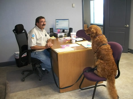 And that is just what Gold Nut got. The lucky dog, now named Gio, gets to go to work with his mom and dad. “He seems to think he is a lap dog, but he will get down when I tell him to. He likes to sit on the chair beside Carl’s desk, as you see in the photo. We tell the customers he is waiting for his estimate.”