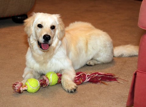 Hi! It’s me, Krispy. I’m happy to report that my foster family decided I’m just too cute and charming, so they adopted me. Seems lots of people questioned if I was a true golden retriever, and to settle the debate, my family had a DNA test done. Turns out I’m all golden, yep, 100%. Something called an English cream….doesn’t that sound yummy? Anyway, I’ve grown in the past few months and have a silky thick blonde coat.