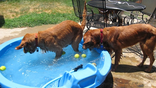What better way to relax on a hot afternoon than by taking a cool swim with a friend? Here you see Alex and his buddy Louie getting ready for a refreshing splashfest. Foster dad says, “Louie is somewhat darker in color than Alex, but they are two-peas-in-a-pod. They look similar in the face, they stay & play together all the time, they sleep together, they both are ball nuts, they are about the same size, and they are similar in personality = one hundred percent friendly.”