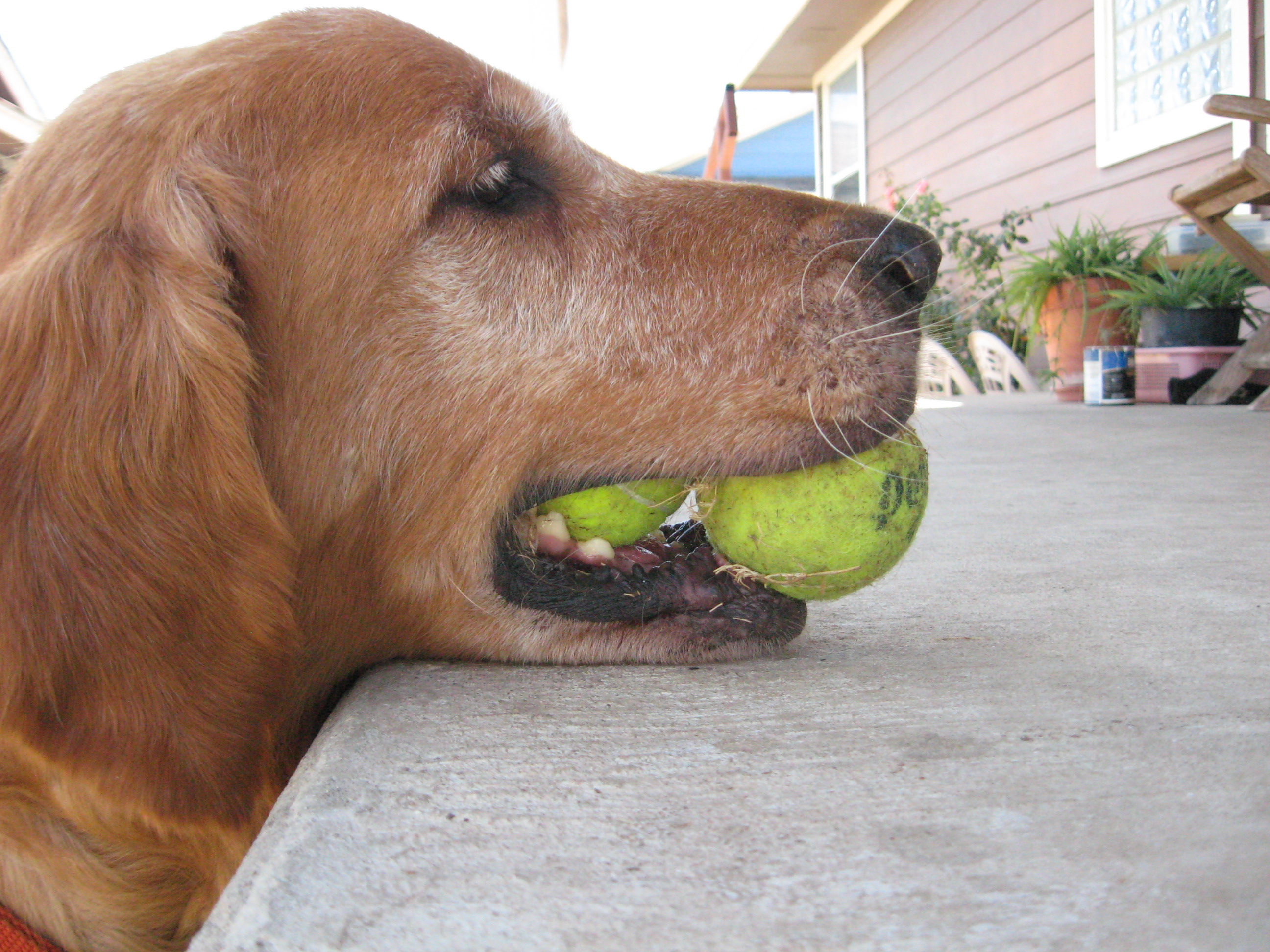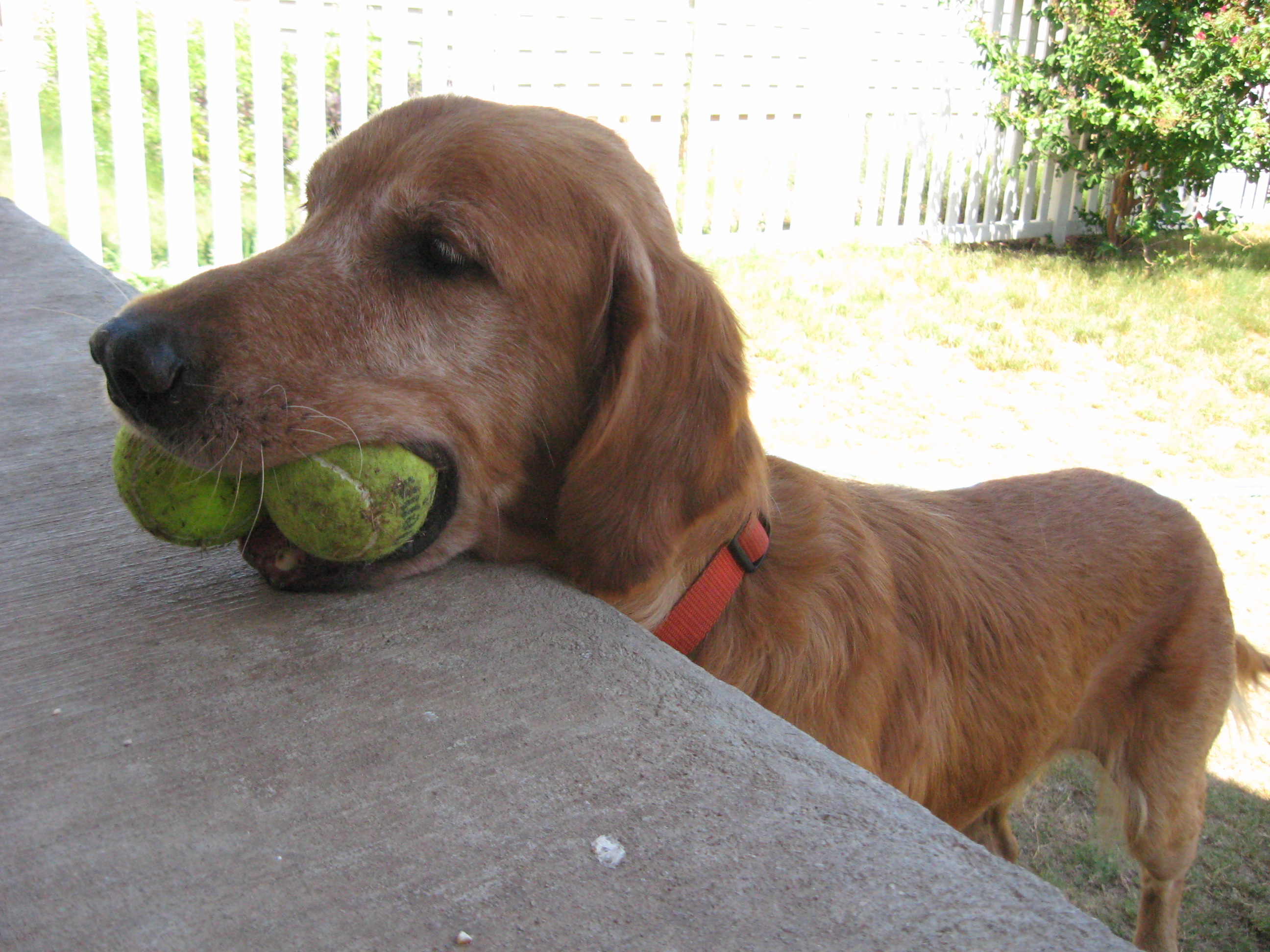 Well, today he was in the wading pool and had his new bigger ball in his mouth when he spied a tennis ball floating in the water, so he pushed his head underwater to employ his usual technique. I was watching him. He kept his head under there for some time and finally came up still with the big yellow ball in his mouth and I was thinking he did not get the tennis ball. So much for my theory —he walks over to me and drops the big new ball, and then a tennis ball comes out! I have no idea how he forced the tennis ball into that mouth, which was already full of his new ball. At least I found out he can hold his breath for awhile. I could not stop laughing…Alex makes me laugh all the time.