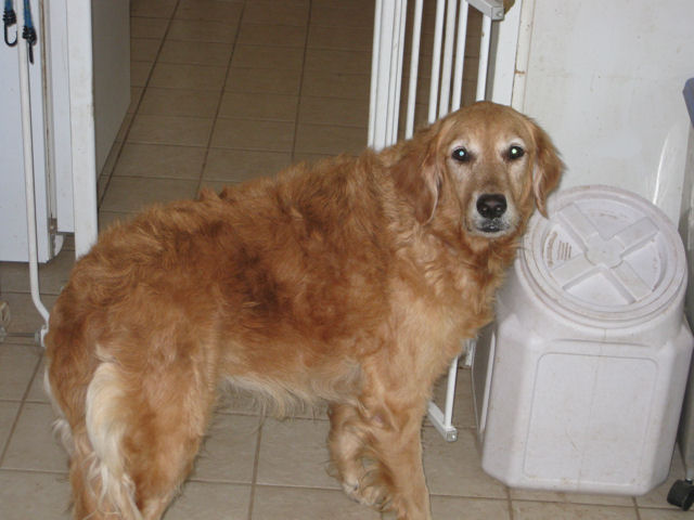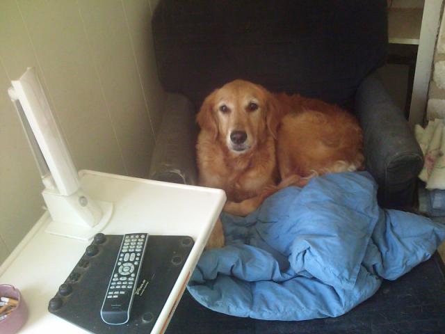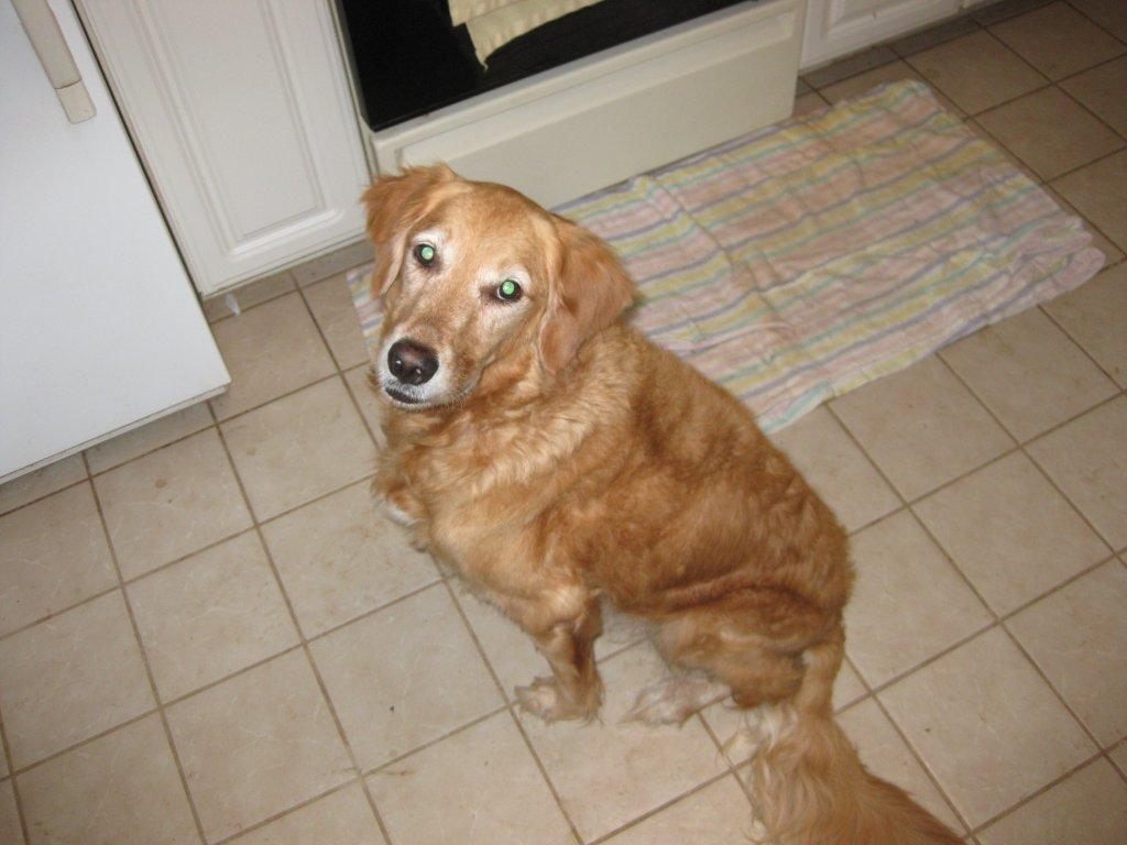 B: Totally unrepentant dog, with typical “Who, me?” feigned innocent