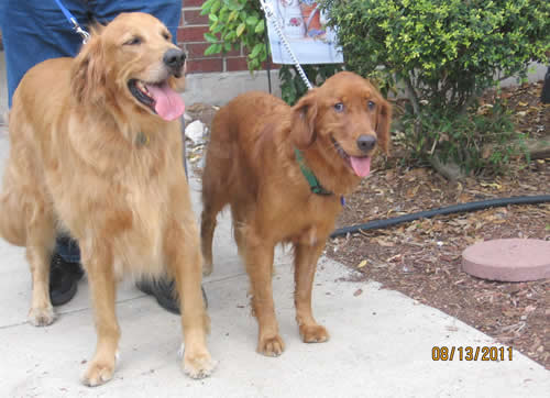 Example: 53-pound Takota. And as you can see, this petite red-headed sweetie looks even smaller next to his pal, 90+-pound Herman (whose GRR name was “Goliath”)!