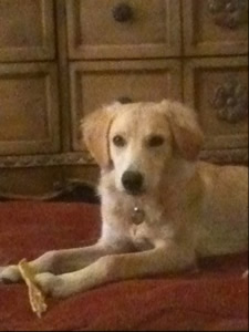 By the way, Groovy isn’t just little in age – he’s little in size, too, weighing just around 30 pounds at around one year old. So he won’t be a standard-size Golden when he’s all grown up, but, “I don’t see any other breed that stands out,” says his foster mom. “He is definitely underweight, and he has fairly long legs and decent paws for his size (who knows what kind of nutrition he was getting?!). He has a longish snout (but then so does my registered Golden). His fur and pantaloons and tail feathers look Golden (he is very light-colored). He may be one of those ‘mini’ Goldens, but he will look so much better with some groceries on him & a healthier, thicker coat.”