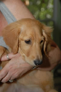 Violet is also a love, and so cute with her pensive eyes and long, soft ears. She will put the two tiny ones in their place if they pounce on her too much, but doesn't get ugly with them. She’s very people-oriented and loves, loves, loves attention and lying in your lap. She doesn't have that chunky little puppy build; she is much leaner and lankier, and we suspect she may be one of those “mini” size Goldens when she grows up. This little gal is definitely feeling under the weather—she wants to play, but wears out quickly. She doesn’t have much appetite at all, and we wonder if she isn’t anemic; she had lots of ticks on her when she arrived in care. She’ll be going to the vet pronto for diagnostics, and we all hope she’s feeling up to snuff soon.