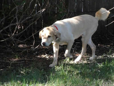 *Editor’s note: The vet noticed that Heidi was limping slightly and holding her tail up a bit, and thought she may have twisted her back. She headed off for a chiropractic adjustment, but X-rays revealed that Heidi had a pelvic injury (hit by a car?) a long time ago. The damage was surgically repaired: the right femoral head (that is, the top “ball” part of her thighbone) has a pin in it. The vet says, “The reason Heidi holds up her tail is that the lower part of the tail & the sacrum healed that way. She uses short strides in her hind legs as they won’t extend much. Her hamstring muscles are somewhat atrophied. She is doing well, considering!” We’ll start Heidi on Synflex (a glucosamine/chondroitin supplement), as well as fish oil caps, and add Rimadyl or another NSAID later on, if needed.