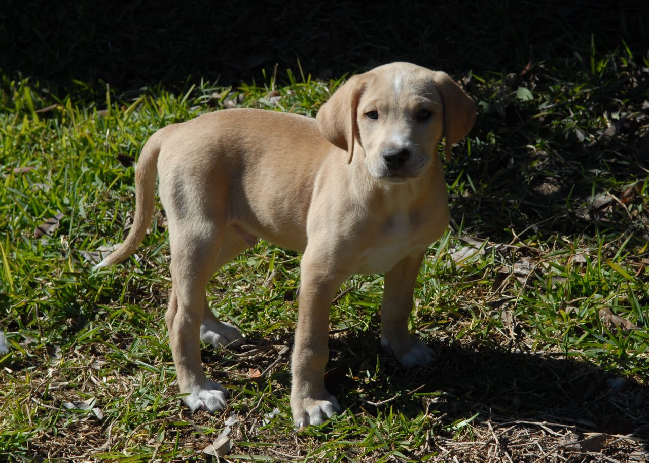 Butterball lives up to his name, and has a cute little round belly. He is very sweet, and is a beautiful light caramel color with the shorter fur. He is a very easygoing fellow, loves to snuggle in with the other pups, and loves to come and say hi as soon as we go in their enclosure. He has white markings on the tip of his tail and some on his face as well. He is another cuddler.