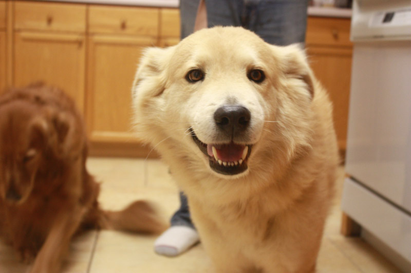 Yes...smiles! He has one of those grins where he shows his teeth and wags his