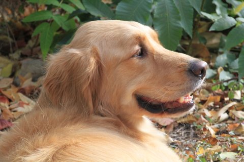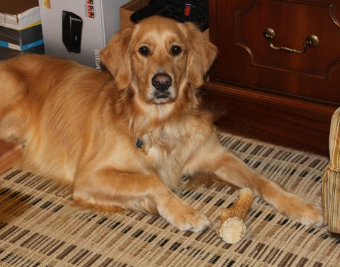 with three other Golden friends, and they share antlers and tennis balls, ride