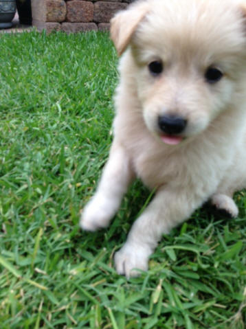 solid blonde pup with short fur (Erin looks a lot like her, but with a longer