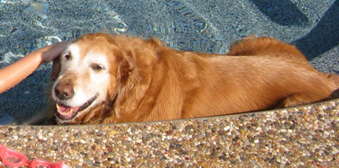 Swimming is great for old bones, and here you see Sammie lounging in the pool… even in October, she is still a pool hog, getting in and lolling on the top step, even when nobody else wants to take a dip.