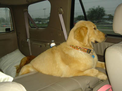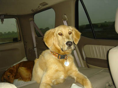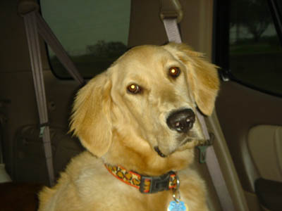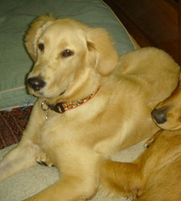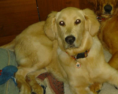 Found running stray back in August, Rocket is 10 or 11 months old now, with all the energy you’d expect of a young Golden. He’s a handsome boy with a beautiful coat, a sweet personality, and LOTS of zip! He loves his Golden foster sister and spends hours play-fighting with her until they are both too pooped to play any longer. He’s great with cats – as far as he is concerned, they don’t exist. He loves all his toys, too, and promptly shreds them to pieces no matter how “dog proof” they (supposedly) are, but he is a good boy and does not tear up anything but his own toys. His favorite sport is swimming, and he’d stay in the pool all day long if we would let him. Another favorite sport, unfortunately, is attempting to “rocket” after cars—that’s one that we are working to discourage, needless to say! We’re teaching him to “look” and offering a super-special treat each time a car comes into view, with the idea that eventually he’ll be so excited about the treat that he’ll sit down and look at mom & dad, NOT at the street, when he hears an auto approaching.