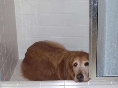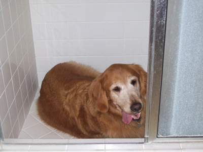 She is outgoing and kisses our houseguests (human and canine). Watch out when you climb out of the shower—she'll put her cold nose on your bare skin! And every now and then, when she’s overflowing with joie de vivre, she’ll exuberantly jump up & slam her feet into our chests—oooof! That gal can pack a punch. Elderly, tiny, &unsteady folks might have a problem with such enthusiastic displays of affection.