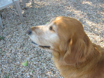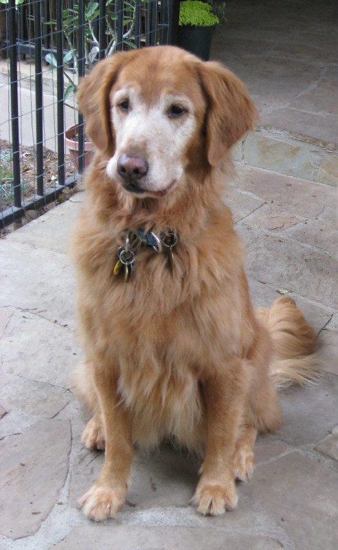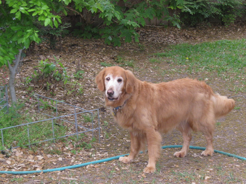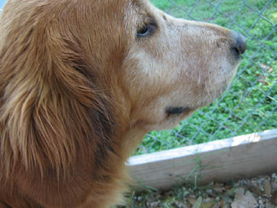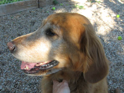 Who knows where this clever girl had been before she turned up stray one day? The lively redhead with a white face may look like a senior, but her pep & go say otherwise. A nice family discovered her just strolling down the street and took her in while they did all the usual things – posted signs, ran ads, called vets. Nobody came looking. Meanwhile, Beatrice was busy proving herself to be a close relative of Houdini. “Secured” in the backyard, she first dug out and went out for a walk. Animal Control, knowing who was holding her, chauffeured her back home. Nothing daunted, the resourceful dog then clambered over a low area of fencing and set out again. Nabbed once more by AC, she arrived back home – but this time with a warning. “If she gets out again, we’ll have to take her to the local pound.” That was enough to motivate her Good Samaritan to place a pronto call to GRR.