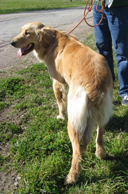 At a local shelter to check out a few other dogs, a volunteer for another rescue group spotted a big gold dog in a back room. Seems he was on hold for an adoptive family, but 3 days past the pick-up date, they still hadn’t shown. She called our Hotline: “I am pretty sure he’s purebred… lighter gold, has a big block head.” A GRR volunteer headed out right away—one look at him, and it was “Wow! we hit the jackpot with this one.”