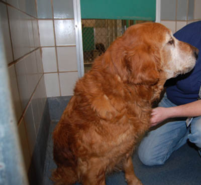 With his wavy dark red coat, open smile, and busy, friendly personality, this 8-year-old is definitely a keeper—hence the name. “He is adorable! He was behind the counter at the pound, standing up like a person waiting to help. The staff loves him. He still has plenty of energy & does a cute little bouncy dance. Good in the car, very responsive, just a fun guy.” Unfortunately, Keeper has heartworms… and at the vet for his check-up, he suddenly became feverish, then started to have trouble breathing. X-rays showed serious lung congestion, and blood tests revealed the problem: ehrlichia, a tick-borne disease. With anti-inflammatories and antibiotics, though, he’s feeling better, and he’ll be continuing his meds for a while. His badly swollen and infected ears also need help. Right now he’s enjoying rest and recuperation at a nice quiet foster home, and we hope to report soon that this wonderful Golden is back in the pink!