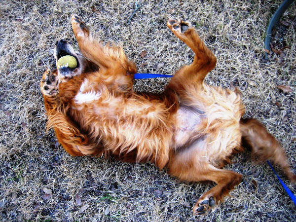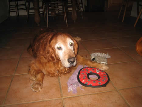 The March report: Major improvements in Keeper's health and habits. He has adapted so well to indoor living and is happy, happy, happy! He is trustworthy in the house, either baby-gated or free to roam. He gets along well with other dogs and walks very well on his leash, though he sometimes tries to surge ahead to check things out. His house manners are much improved—not as much mooching, though he’ll still do a little counter “shopping” if you are not looking. He ALWAYS has a toy or ball in his mouth! Just likes to carry them around; lets you take them out with no problem.