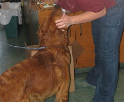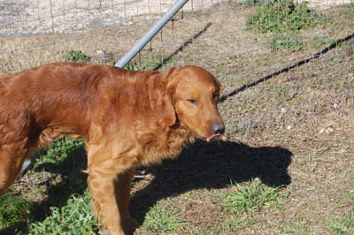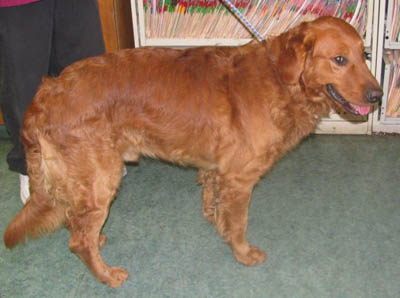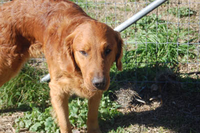 With wavy red-gold fur and a sweet smile, Brick turned out to be just as nice as advertised. “He puts his head in your lap when you hug or pet him. I did test him with their clinic cats and he was not interested in them at all. He was great with the other dogs -- lab mix, pit bull, and the Jack Russell. They house the dogs in a trailer with poor ventilation. There were only four dogs but when you open the door the smell almost knocks you over. His euthanisia date is tonight so we need to grab him today.”