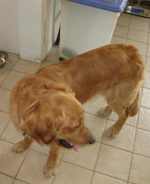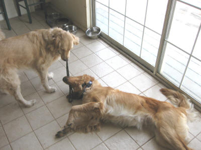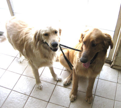 Austin is a normal, lively 12- to 18-month-old who needs lots of exercise, lots of play and basic obedience training. He mingles freely with our three Goldens when one of us is here, and there have been no problems. Libby and Austin love to play & they have the same style—lots of bitey head, bitey leg, rough-and-tumble action—they wear each other out! Emma likes to observe from afar and Casey likes to stay out of the action all together. (: