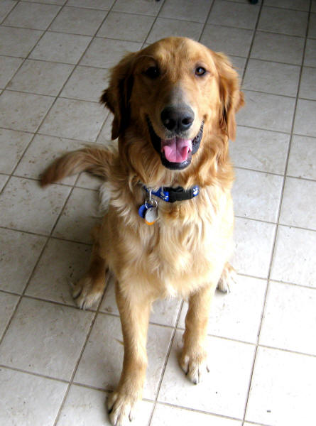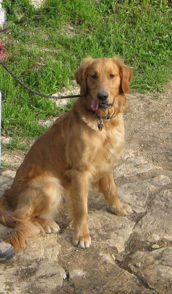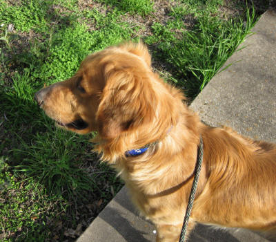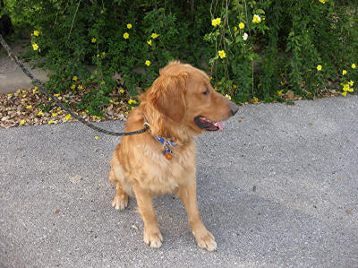 This is an average to high-energy guy. Like any young Golden, he needs activity and stimulation—lots to do and see! Other dogs to play with, cats going through the front yard, squirrels in the trees, people walking & jogging past our house—it all keeps him occupied. For the most part he wants to do what you want him to do IF he knows what that is! He is a sweet, silly, sometimes independent fellow who needs a family who will take him to positive training classes, take him out walking, and just have a good time guiding a youngster along the path of becoming a good canine citizen.