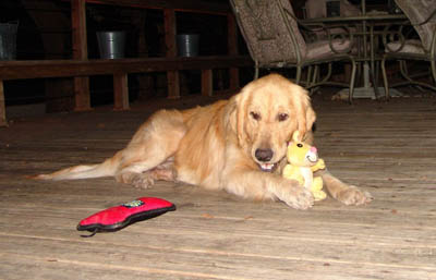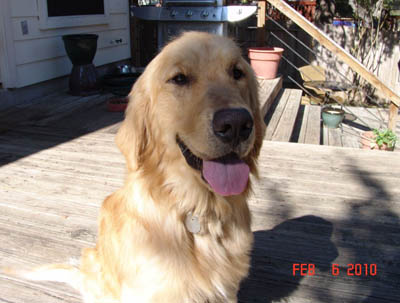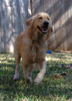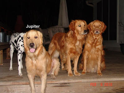 Unfortunately, beautiful Jupiter has hip dysplasia—not an uncommon problem in Goldens. He is doing fine now and shows no symptoms other than a bunny hop when he runs. The vets feel he does not need to have surgery now, but he may need it in future… or then again, he may not! In the meantime we have him on glucosamine and Syn-Flex, and he will need to stay on that forever.
