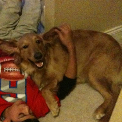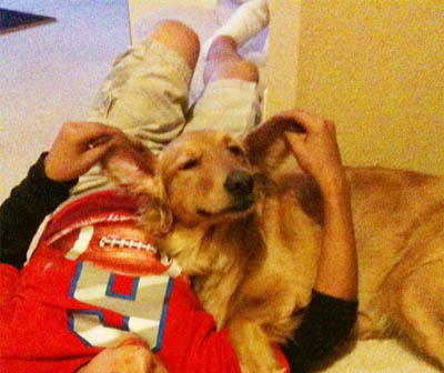 Guess we could stop right there! But to elaborate: He’s totally housebroken. He’s happy and calm with kids. He jumps a little, but it’s very light and gentle and easily corrected. He plays well with other dogs. He is fine with cats – starts to chase, but then runs away from them! He doesn’t pull on lead (though he does zig-zag). He retrieves (and brings it back—though you do have to take the ball out of his mouth).