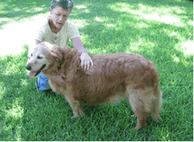 Ruben came to GRR after he just showed up one day in a nice lady’s yard. “Old, fat and sweet,” she said. All true! And also so terribly matted that the vet said, “He needs a trip to a professional groomer.” Which he got… and a whole lot more, too. Ruben was having such a problem with excessive drinking and lots of accidents that his foster mom said, “This has got to be more than stress.” And it was – the vet ultimately determined that Ruben’s symptoms were due either to a tickborne disease or to his heartworms (he just started treatment today, April 19), and put him an antibiotic, doxycycline. “Immediate, miraculous improvement!” says his foster mom. “As long as we take him out right after meals, there are no accidents any more.”