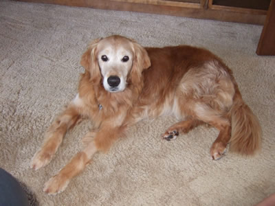 But other than that, well, he is just a peach. And well-educated! “He seems housebroken, and he knows his commands and comes quickly when you call his name. He will SIT when you ask him to, and he even knows LIE DOWN.. He is really a cool dog and I can’t understand why anyone would want to give him up.. He wants to please and is just a happy Golden. He would do well as only dog. He is so gentle I think he would do well with kids too.He has only been here a few days but we all love him already. Very sweet guy.”