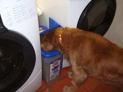 close the top on the dog food bin, he will flip the top with his nose and stick