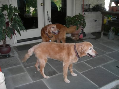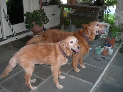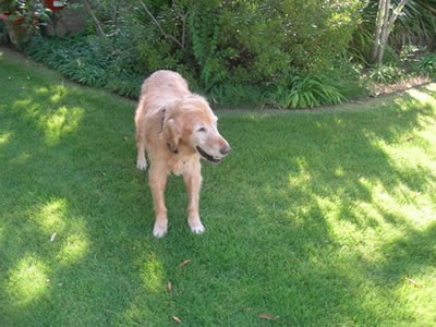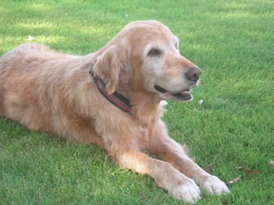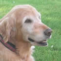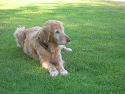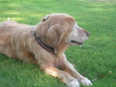 On July 2, 2010, a petite senior Golden arrived at a local shelter. Since nobody came looking for her, GRR was called—and this little girl, given the name “Bubbles,” became part of the GRR family on July 6. First stop was the vet clinic, where Bubbles had a bath, a check-up, and, on July 9, surgery to remove a small growth on one eyelid and to repair entropion in both eyes (entropion is a condition in which the lower lids turn inward, so that the lashes scratch painfully at the eyeball). On Saturday, July 10, she headed to her foster home, wearing an Elizabethan collar. She was always sweet and patient, but her foster parents could tell she was in pain despite her pain meds; they were worried, too, about a pink discharge from her left eye. So, first thing Monday, another vet date was set; and on Tuesday, Bubbles ( by then affectionately known as “Phoebe” to her family) underwent emergency surgery. It turned out that a loose suture was scraping at her cornea, and the vet stitched Bubbles’s third eyelid down to aid healing and keep the eye protected. For the next 3 weeks, this darling, patient lady had to keep on wearing that hard E-collar to keep her from scratching at her eyes.