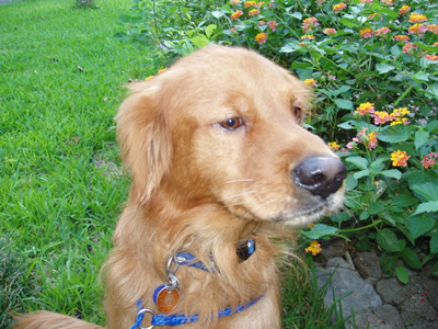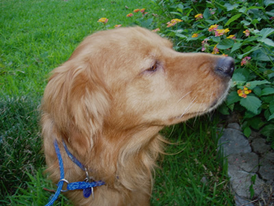 He is good on a leash. Like many Goldens, he will tend to lead for the first block or two, then be right with you the rest of the way. If he does forget to heel, gently taking the slack out of the leash and giving a verbal command to heel will bring him back.