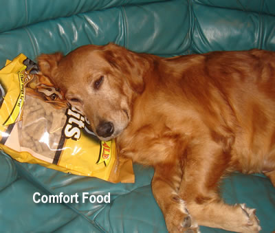 Madison is progressing well. She must be wherever we are. We think she gets frustrated with us—she is such a couch potato and we don’t sit for an extended period of time, so she’s forced to get her exercise following us from room to room! As we indicated in our last report, she continues with her thief antics. She steals bags of dog treats. Robb made a placebo replacing the biscuits with a soft, squishy bean bag heating pad into an empty bag of biscuits, but she saw right through it. Nonetheless, she found this to be a comfortable pillow. She takes it from the pantry shelf and places it in her den and rests her head on it. Typically Madison will steal a bag of biscuits and place them on the sofa next to her; but this morning, she carried the bag of biscuits (mind you, it was a full unopened bag, which weighs 4 pounds) upstairs and then came back down shortly with it in her mouth. That’s one tough girl and jaw! Attached is a photo of Madison resting on her biscuit bag—talk about “comfort food”!