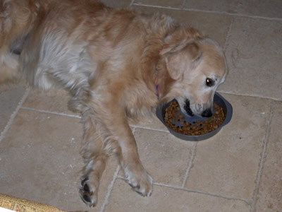 It was not surprising that Jakey gets along fine with our Golden, since he came from a home with two other dogs.  They eat side by side and go out together without any squabbling at all.  A few days ago at dinner time, Jakey was lying on his side on our breakfast room floor. When I called the dogs to eat, he just lay there wagging his tail and looking at me with huge brown eyes.  My husband picked up his dish of food and put it down in front of his nose.  Jakey proceeded to eat his entire meal without moving from his side.  It was hilarious!  Perhaps he was a Roman emperor in a former life and is used to having servants feed him grapes while he reclines on a sofa! I have a feeling we will not have him for long.  Some lucky family is going to snap him up!