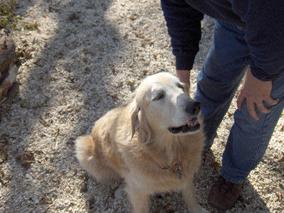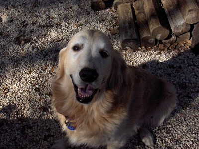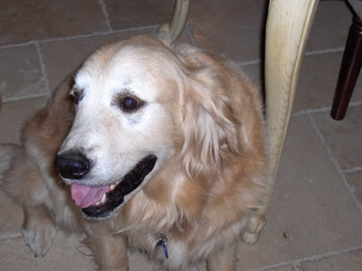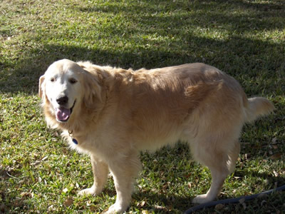 Big, blond, and handsome, Jakey  came to GRR when his family had to move. This wonderful guy has a slightly unusual profile – his jaw looks a little funny, and some of his teeth (top and bottom) are missing. Why? Well,  when Jakey was just a tiny fellow, a nasty little boy who was visiting the family conked the new puppy in the face with a bat. Jakey had to have surgery. Luckily, he came through it fine, with his Golden personality intact, but he does have a distinctive look as a result!