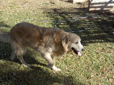 When we must leave the dogs, we are able to let him roam the house freely. He goes to his bed and sleeps until we return.  When we are outside working in the garden, Jakey is happy to flop on the porch in the sun and watch.  He does not seem to know how to play.  He does not retrieve.  We thought our dog might teach him to go after toys we throw, but Jakey wants to come lie down right under my feet and watch our dog do all the work.  When she gets tired of retrieving he will then pick up the toy and take it off to sleep with.