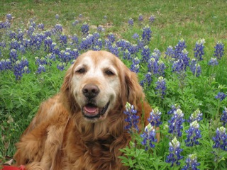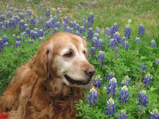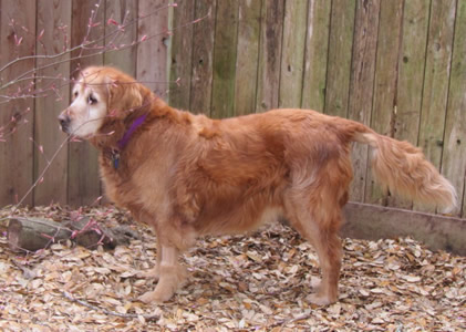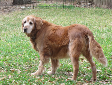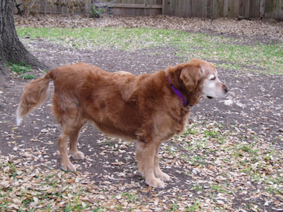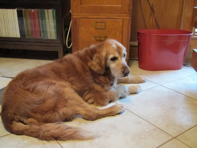At the clinic, along with a name (“Molasses”), the first GRR Golden of March 2011 got the full medical work-up. We were expecting bad news, but -- no heartworms, no intestinal parasites, just a cyst on her head (benign) and a tummy absolutely loaded with, literally, garbage. She’d apparently been dumpster-diving to keep body and soul together, and whatever rubbish she had eaten had made her deathly ill. No sooner had she arrived at the hospital, in fact, than her body set about getting rid of the whole mess—it was “good riddance to bad rubbish” with a vengeance! Good thing she was in the right place to get IV fluids to prevent dehydration (not to mention a much-needed bath and anti-flea treatment once she was out of the woods).