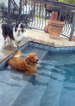 Gio has a doggie sister, Bella, to help him burn off his energy—and “they can get pretty crazy when they are playing! They run like crazy chasing each other in the yard.” At his first home, he had a kiddie pool, but now he has a grown-up pool, and he’s still getting used to it: he just sits or lies on the first step so far.