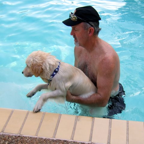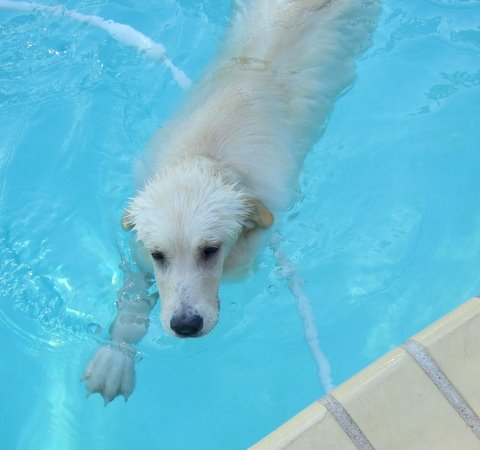 Most puppies don’t understand boundaries and they have no fear, right? Why, they’ll run smack into trouble, but not me. I have to get the lay of the land before I go barreling into something. For example, yesterday I got to go swimming. Wasn’t sure about it at first, so I stood back a safe distance and watched the other dogs jumping and splashing. It looked like fun, but I couldn’t work up the nerve to jump in. My foster dad saw my hesitation and eased me into the water. With a little encouragement, I was swimming, too. Take a look at my picture! Don’t I look like a polar bear cub? Notice my golden retriever webbed feet? Mom thinks we should change my name to PolarJ