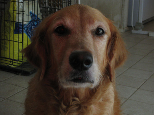 B: Totally unrepentant dog, with typical “Who, me?” feigned innocent